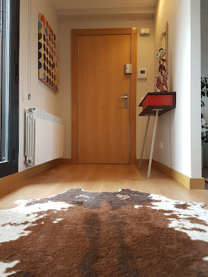 Lo que si tenía claro era que quería una alfombra de piel de vaca para mi entrada, pero no una alfombra de piel natural si no sintética, no me gusta pensar que piso una autentica vaca cuando entro en casa.